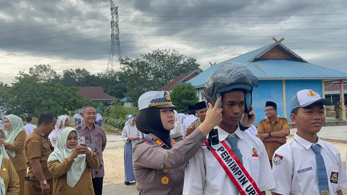 Sebagai bentuk kepedulian terhadap keselamatan guru dan pelajar dalam berlalu lintas, Satlantas Polres Kampar memberikan beberapa unit helm SNI.